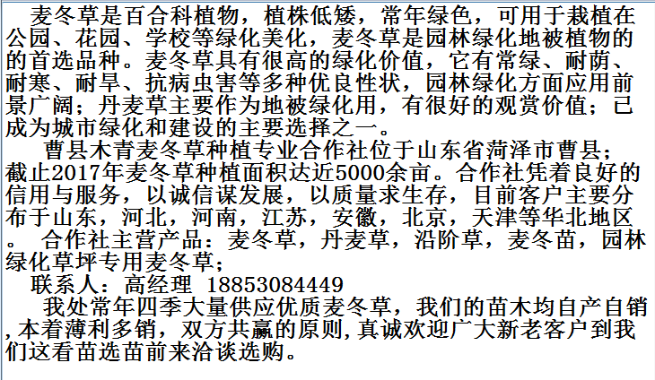 山东曹县麦冬草种植专业合作社位于山东菏泽曹县;集麦冬草种植、麦冬草批发、麦冬草仓储、麦冬草配送于一体的专业企业。 截止2017年全镇麦冬草种植面积达近5000余亩, 年产优质麦冬草1000000吨以上;合作社凭着良好的信用与服务,以诚信谋发展,以质量求生存,目前客户主要分布于山东,江苏,河北,湖北、河南,北京,天津等地。热烈欢迎新老朋友前来基地参观、考察、洽谈业务。 合作社主营产品:麦冬草,,丹麦草,麦冬苗,绿化草坪专用麦冬草;
